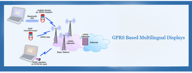 GPRS based multilingual display are based on the concept on wireless TCP/IP using GPRS technology in which the PC and all the displays will be on a wireless network. These displays will connect to the server, transfer the relevant files which contain the messages and decode and transfer the messages to the displays.